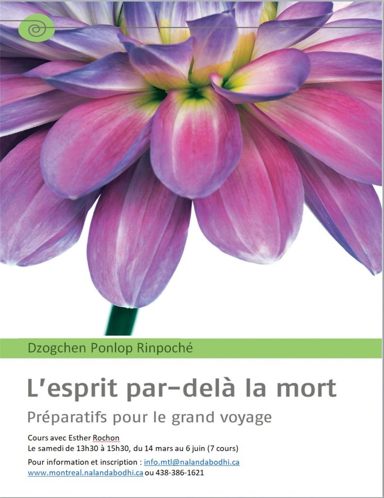 Facilitatrice invitée: Esther Rochon, elle a traduit le livre « Mind beyond death » et comme pratiquante senior, elle nous guide dans la compréhension de ce merveilleux livre.